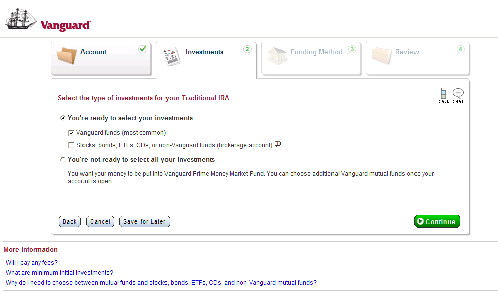 The design team was tasked with redesigning money movement flows at Vanguard, starting with the Open Account process. User abandonment was high; approximately 75% of users had failed to complete the task online. The number of steps to complete the task ranged from 17-80 depending on the account and transfer type, and a key goal of the design team was to streamline the process and reduce the number of steps for all open account activities.